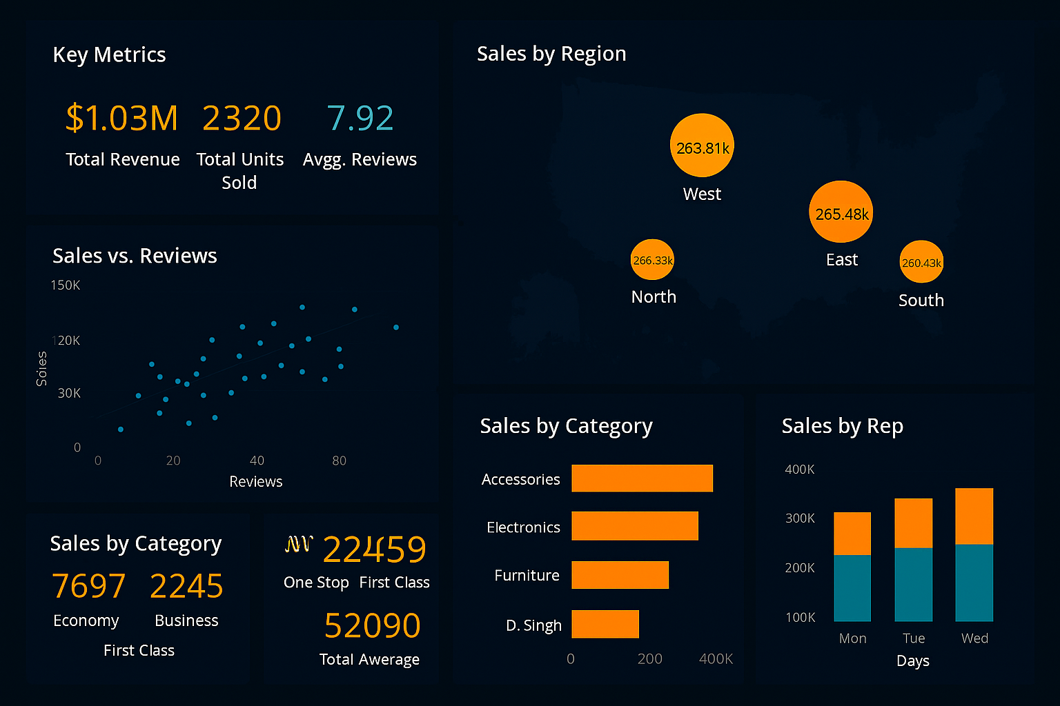 Comprehensive dashboards analyzing regional and product sales performance, providing actionable insights for business growth and inventory management strategies.